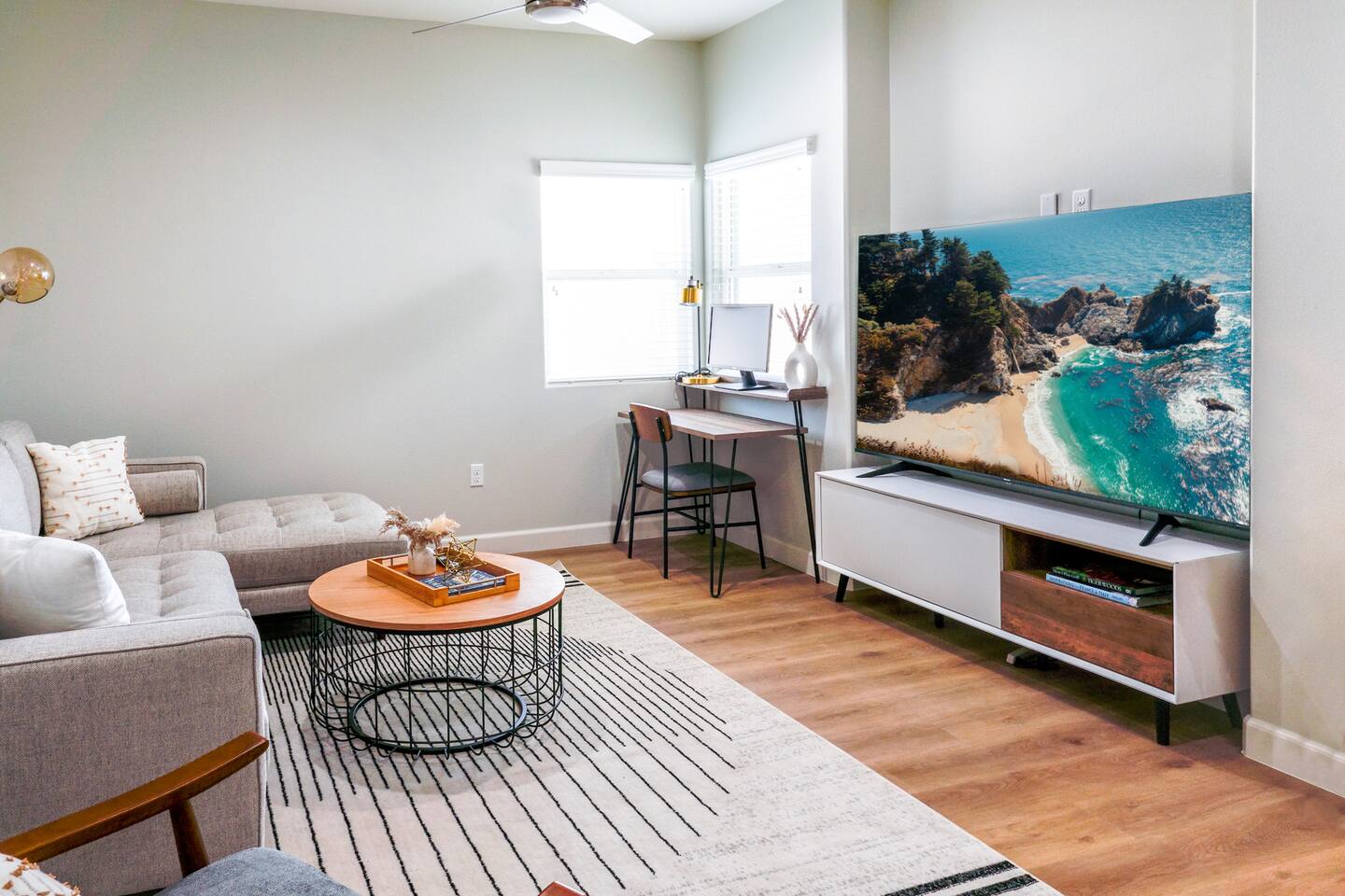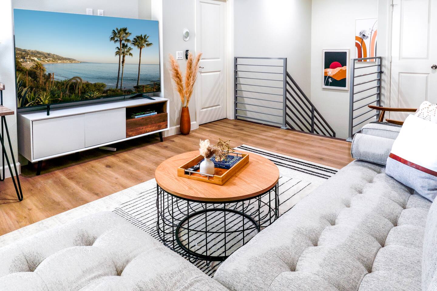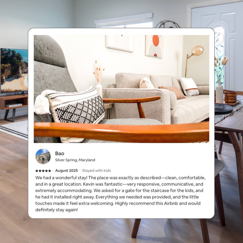 Welcome to Your Dream Modern Escape in Orange County! This breathtaking modern luxury unit seamlessly combines opulence and comfort, making it an ideal destination for families and friends seeking an unforgettable getaway. KEY FEATURES: ☀ Sleeps up to 10 guests ☀ Spacious 3-bedroom home with 3 full bathrooms ☀ Spacious Loft Living Room (Upstairs) ☀ Fully Stocked Kitchen with coffee/tea station (Please see photos and full amenities list) + Pots/pans, kitchen knives, basic condiments, cooking spices, cooking oils, salt, pepper, bakeware, dinnerware for adults & kids, wine glasses, cups, coffee mugs, plates, bowls, dishes, cooking utensils, measuring cup, blender, toaster, and more! + Keurig Coffee Machine with K-cups & coffee essentials + French Press with coffee grounds + Tea assortment available at the coffee/tea bar. ADDITIONAL FEATURES: ☀ High Speed Wi-Fi Internet up to 600Mbps ☀ (1) 75" Smart 4K HDTV with Netflix (provided), Amazon Prime, Disney+, Hulu, Max, Peacock, Apple TV, and more. ☀ (1) 65" Smart 4K HDTV with Netflix (provided), Amazon Prime, Disney+, Hulu, Max, Peacock, Apple TV, and more. ☀ In-unit Washer & Dryer with laundry detergent, dryer sheets, and more. ☀ Two dedicated work desks (Upstairs + Downstairs) with external monitor available upon request ☀ Comfortable Plush Beds and Pillows + Nightstands with bed lamps that have convenient charging ports in every bedroom ☀ Additional Queen-sized airbed available upon request ☀ Central Air Conditioning and Heating + Ceiling Fans in Bedrooms ☀ Balcony with outdoor seating ☀ Modern stainless steel appliances ☀ Large Luxury Bath Towels, Hand Towels, and Wash Cloths provided ☀ Basic toiletry items, soap, shampoo, conditioner, body wash, make up remover wipes, and more provided ☀ Early Luggage Drop off allowed with prior approval ☆☆☆☆☆ Expect a Five Star stay with us. We have a full digital concierge to assist with any questions, local recommendations and more. Here's what a few guests had to say: "Beautiful place. Very clean and organized. Kevin is a great host. Will come back in the future!" - Vi "Amazing home! Just felt like home. Cozy vibes & supper clean. Highly recommend!!!! Definitely will come back!" - Y (Please see all the reviews from all of our past guests) ☆☆ Bedrooms ☆☆ Three Bedrooms: ☀ Bedroom #1 (Downstairs): + Queen-sized Bed + Spacious closet + Work Desk with lamp ☀ Master Bedroom #2 (Upstairs): + King-sized Bed + Private Master Bathroom with walk-in shower + Spacious closet + Private outdoor balcony with modern seating ☀ Bedroom #3 (Upstairs): + Queen-sized Bed and Full-sized Bed + Walk-in closet ☀ Each bedroom includes: + Lamps and Convenient charging ports at each nightstand + Comfortable plush beds and pillows ☀ Additional accommodations: + Extra Queen-sized airbed available upon request ☆☆ BATHROOMS ☆☆ 3 Full Bathrooms: ☀ Each with a walk-in shower ☀ Fully stocked with luxury bath towels ☀ Essential toiletries including soap, shampoo, conditioner, body wash, hair dryer, floss, Q-tips, & makeup remover wipes ☀ A touch of elegance throughout ☆ ☆ Lounge/Living Rooms and Full Kitchen ☆ ☆ Experience the charm of a spacious loft living room upstairs, ideal for unwinding or entertaining guests. ☀ Two large Smart 4K HDTVs in each living room with Netflix, Amazon Prime, Disney+, Hulu, Max, Peacock, Apple TV, and more. ☀ The fully stocked kitchen is a chef’s dream, with everything you need. ☀ Pots, pans, and condiments included. ☀ Coffee/tea station with a Keurig, French press, and a variety of teas. ☀ Ensuring a delightful culinary experience during your stay. FAMILY FRIENDLY: ☀ Kids’ dinnerware set (bowls, cups, utensils) provided ☀ Pack 'N Play/Travel crib available ☀ High chair for infants and toddlers ☀ Baby Bath Support available ☀ Baby gate available upon request ☀ Popular board games for family fun LOCATED IN THE HEART OF ORANGE COUNTY: Theme Parks: ☀ Disneyland Park - 15 mins / 10 miles ☀ Disney California Adventure - 16 mins / 10.67 miles ☀ Knott’s Berry Farm - 15 mins / 10 miles ☀ Universal Studios - 41 mins / 27.33 miles Beaches: ☀ Huntington Beach Pier - 14 mins / 9.33 miles ☀ Newport Beach - 17 mins / 11.33 miles ☀ Laguna Beach - 25 mins / 16.67 miles Shopping & Dining: ☀ Westminster Mall - 5 mins / 3.33 miles ☀ Bella Terra Shopping Center - 5 mins / 3.33 miles ☀ South Coast Plaza - 15 mins / 10 miles Sports & Entertainment: ☀ Angel Stadium - 13 mins / 8.67 miles ☀ Honda Center - 13 mins / 8.67 miles ☀ Dodger Stadium - 38 mins / 25.33 miles Centrally located near major highways and airports ☀ John Wayne Airport (SNA) - 13 mins / 8.67 miles ☀ Long Beach Airport (LGB) - 16 mins / 10.67 miles Convention Centers: ☀Anaheim Convention Center - 15 mins / 10 miles ☀Long Beach Convention Center - 20 mins / 15 miles ★☆ Book Today & Let Us Take Care Of You In Midway City, Orange County! ☆★ Unleash your spirit with a SoCal adventure! Explore charming towns, surf perfect waves, and savor delicious cuisine.